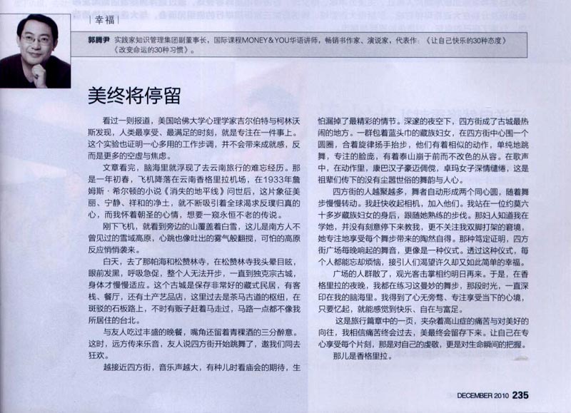 大连《新魅力》杂志2010年十二月下旬刊刊登了郭腾尹老师的的专栏文章《美终将停留》。